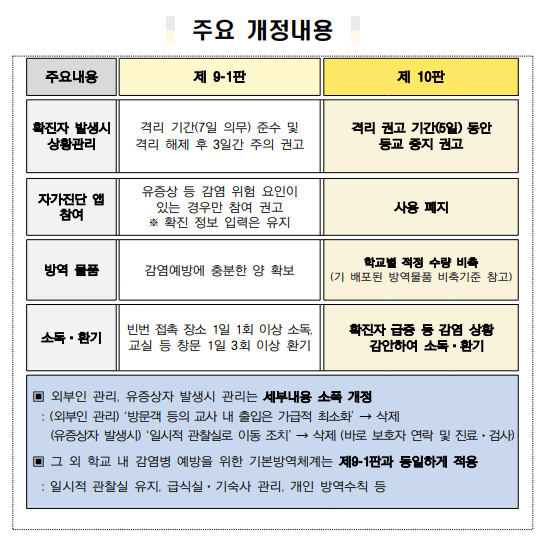 위와 관련하여 교육부에서 내려온 유·초·중등 및 특수학교 코로나19 감염예방 관리(제10판)에 따른 교내방역지침 주요 변경 사항을 안내해 드립니다.