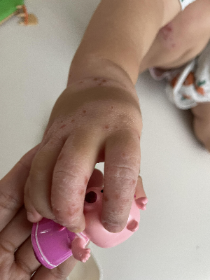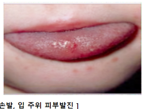 - 발진은 통증이나 가려움증 없이주로 손등과 발등에 나타나고, 빨간 수포처럼 생김.