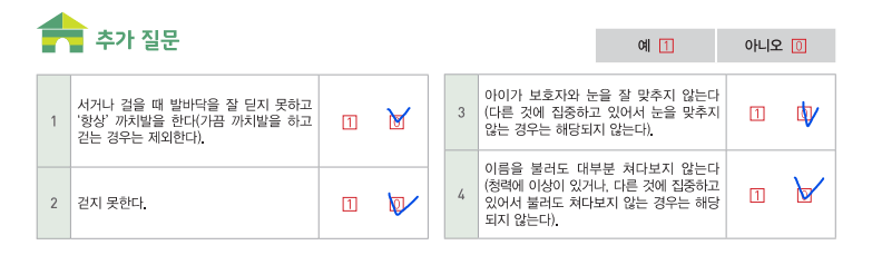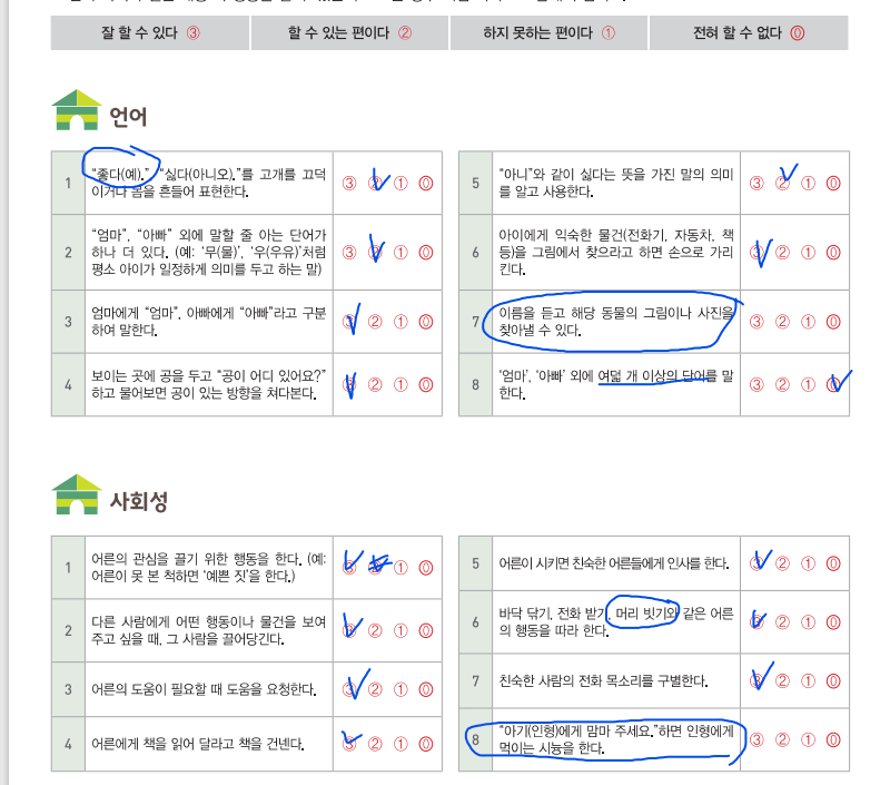 이번에 남편과 함께 검사지를 체크해 보면서 우리 아이의 발달 상황을 살펴보았는데, 아이의 발달에 대한 이해를 돕고 앞으로 어떤 부분을 또 관찰하면 좋을지, 어떻게 놀아줘야 할지 등 가이드가 되는 것 같아 좋았습니다.