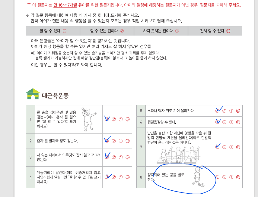 대근육운동에서 정지되어 있는 공을 발로 차는 것은 한 번도 시도해 본 적이 없어서, 동그라미 쳐서 표시하고 놀아줄 때 공을 사용해 보기로 했습니다. 이런 식으로 발달검사 항목에 있는 내용들을 바탕으로 놀아주고, 시도해 보고, 지도해 주면 좋습니다.
