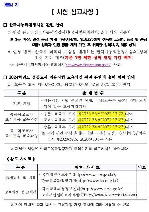 이 규칙은 2023년 3월 1일부터 시행됩니다. 따라서 올해부터는 한국사능력검정시험 유효기간이 폐지되었기 때문에 언제였든지 기존에 한능검 3급 이상을 받았던 적이 있다면, 임용준비하면서 한능검 유효기간 신경 쓰느라 맘 졸이지 않으셔도 되겠습니다.
