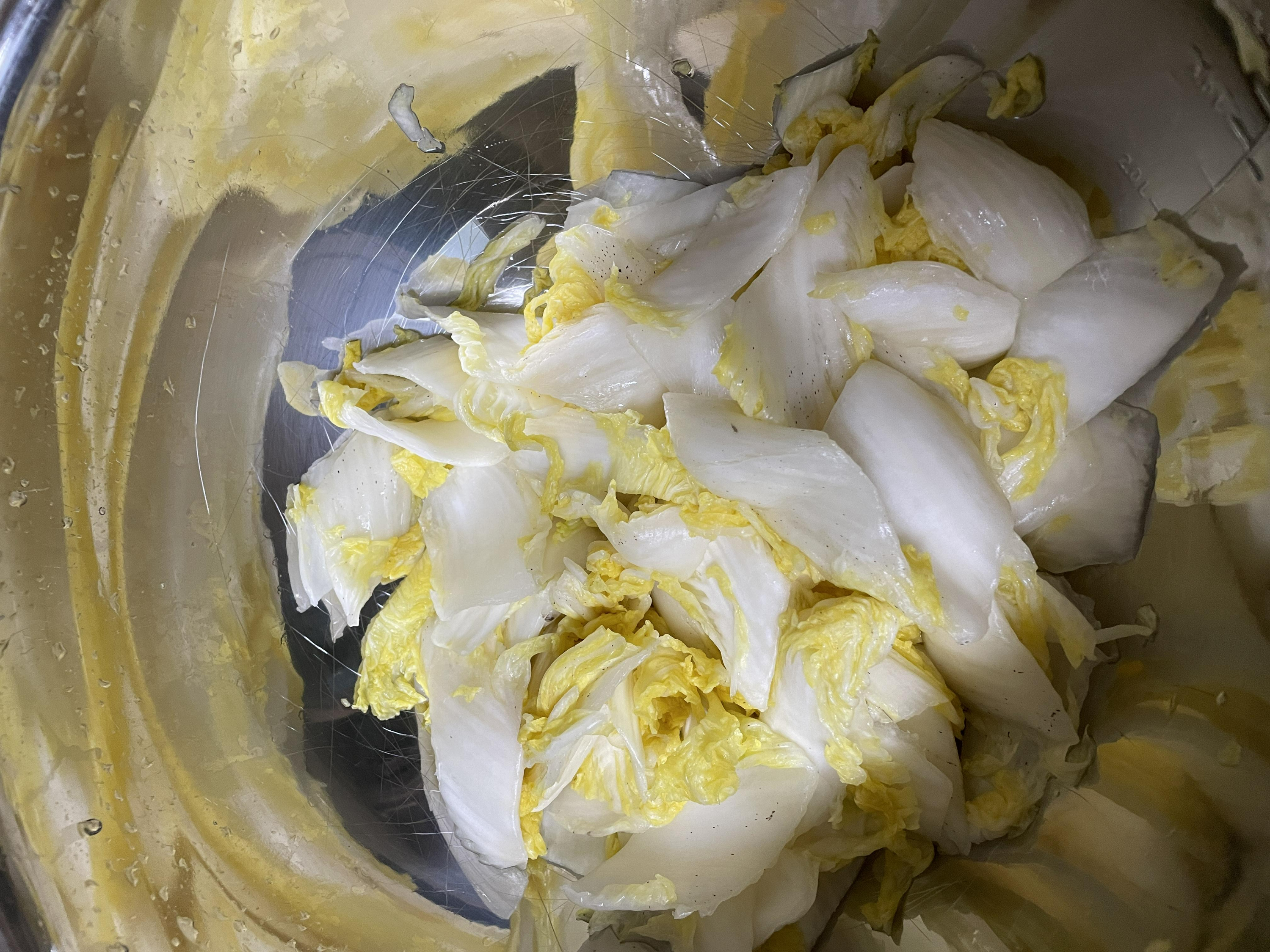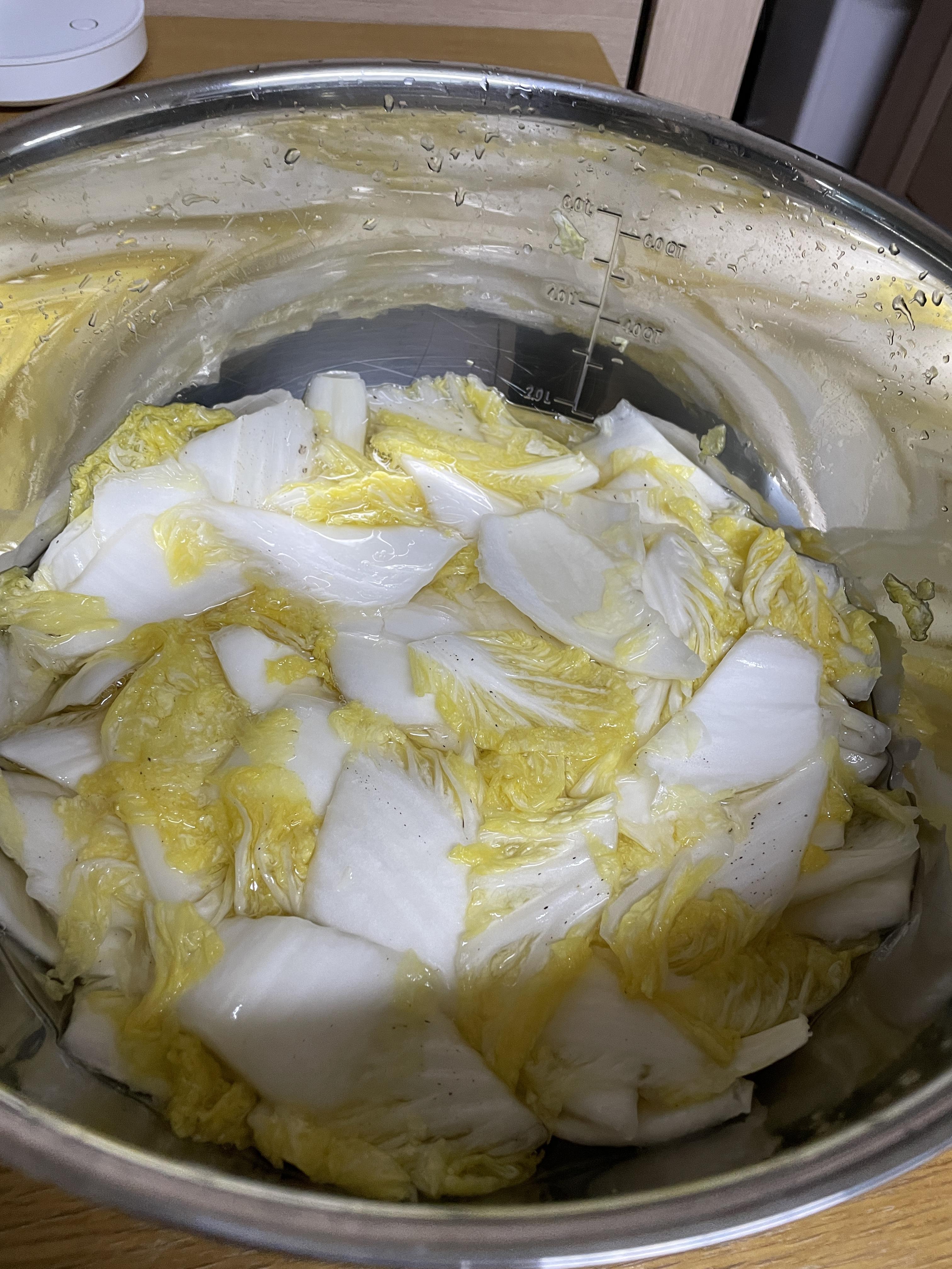 2. 20-30분 지나면 배추 숨이 죽음(잡고 웨이브 탔을 때, 덜 유연하다면 좀 더 절이면 됨)