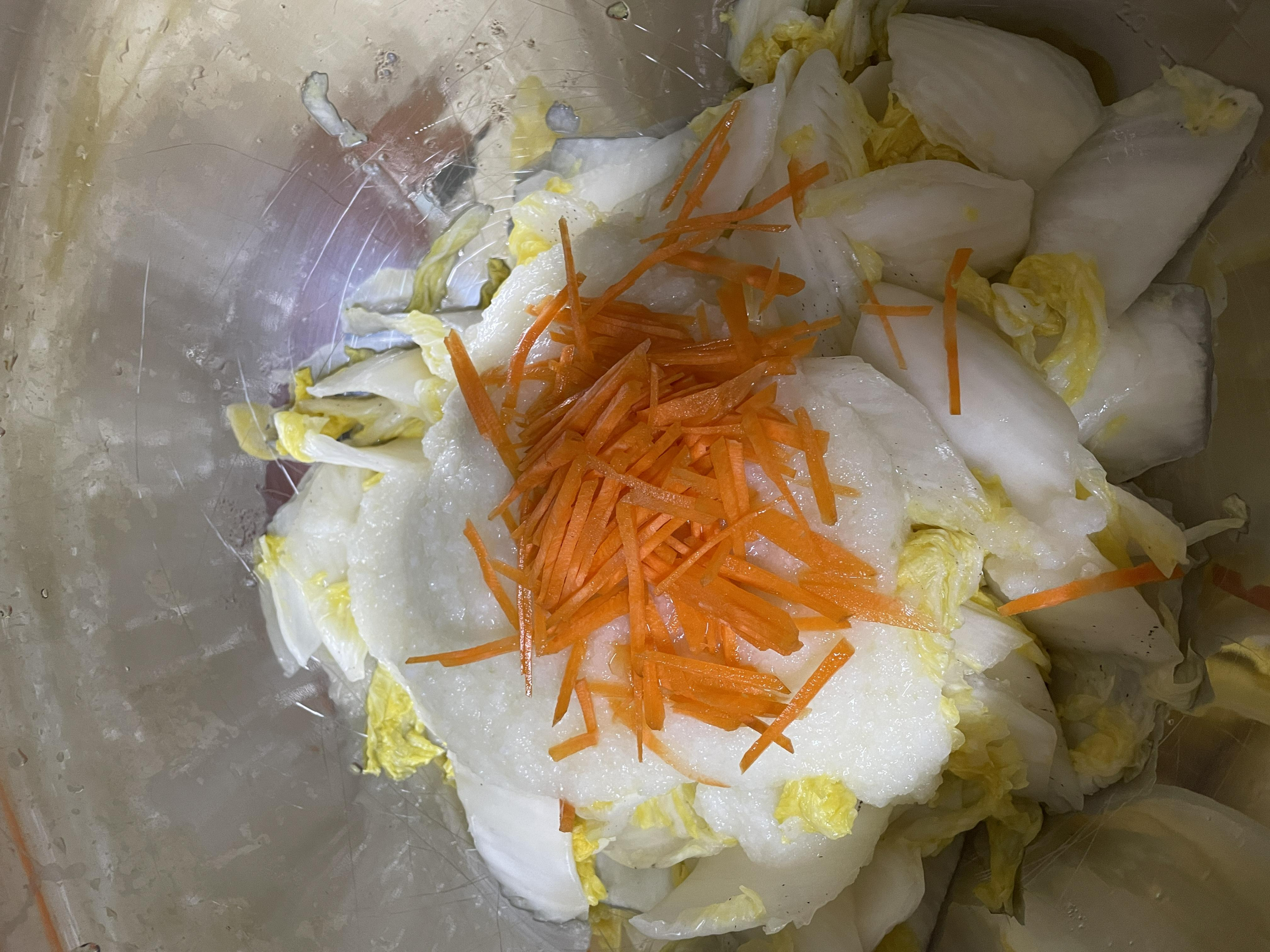 4. 숨 죽은 배추 소금물 버리고 물기 두손모아 꼬옥 짜주고, 당근은 채썰어서 넣기