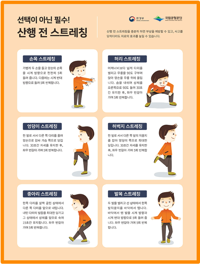 아래의 그림처럼 스트레칭 후 등산을 시작하도록 합니다.