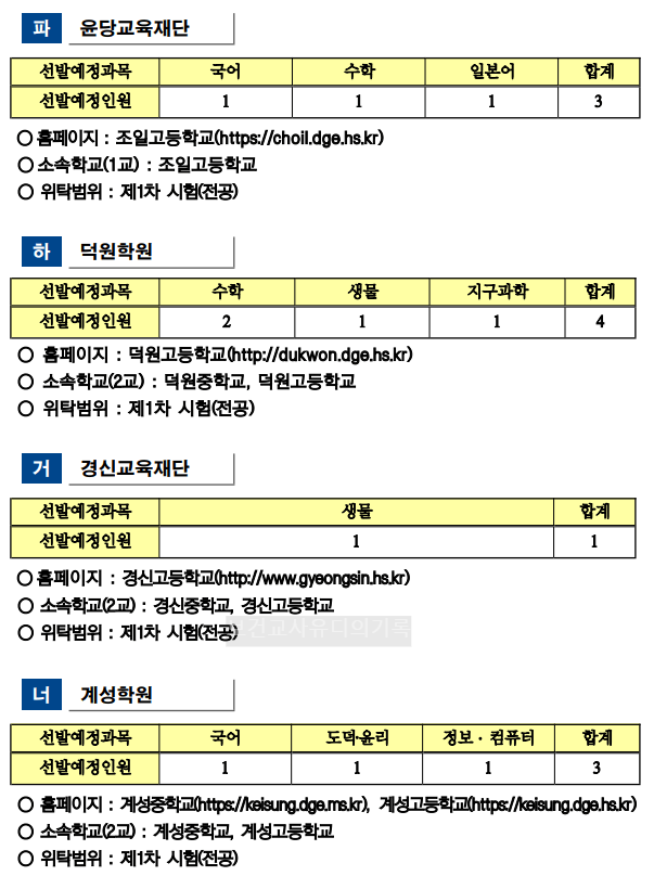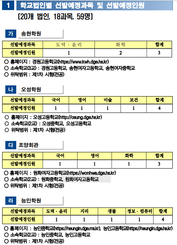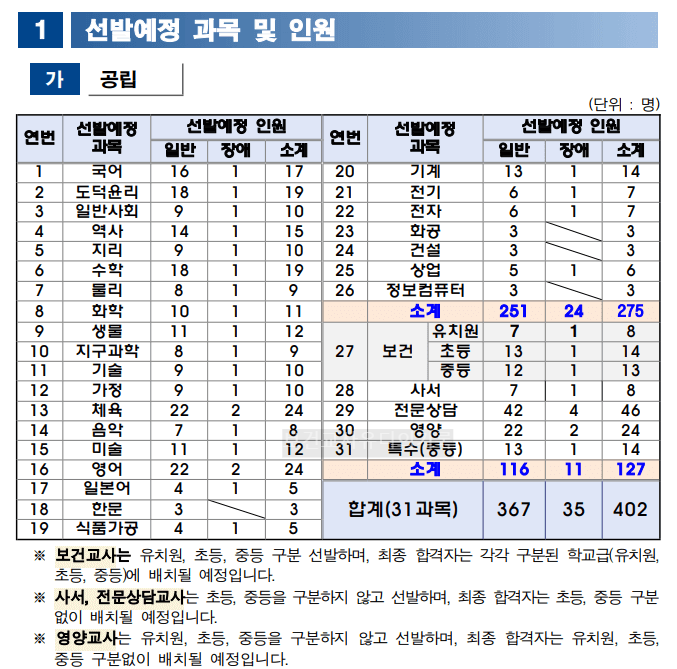 *공립 중등학교 교사, 보건·사서·전문상담·영양·특수(중등) 교사 임용후보자 선정경쟁시험 사전예고는 17개 시도교육청 해당 홈페이지에서 확인할 수 있습니다. 따라서 제가 가져온 자료는 각 교육청 홈페이지에서 가져온 자료임을 먼저 알립니다.