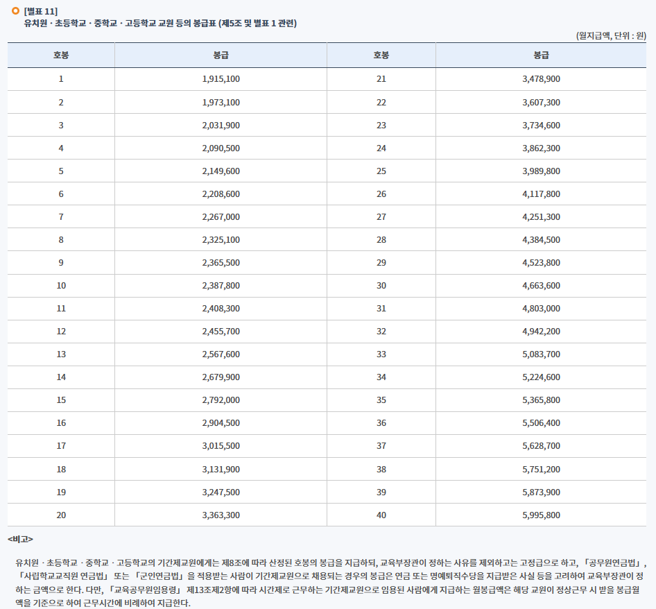 교원 봉급표(호봉표)